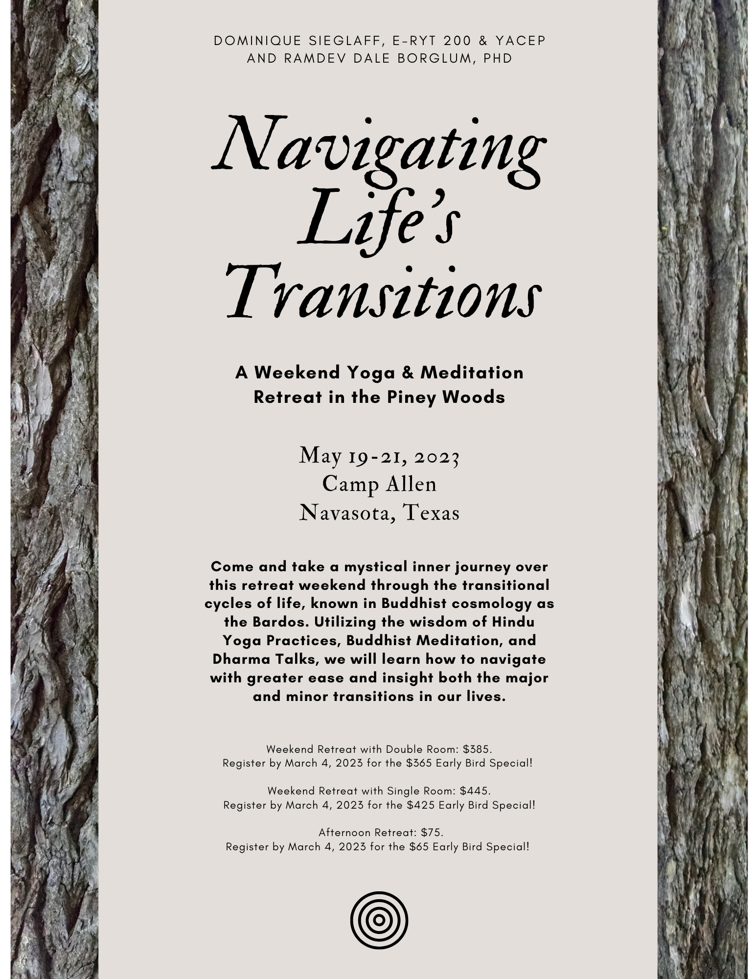 With gratitude I’m happy to report that our May 19-21, 2023 Weekend Yoga and Meditation Retreat, Navigating Life’s Transitions, is now sold out! We have a wonderful group of people coming together for the weekend to practice in the piney woods at Camp Allen in Navasota, TX. If you would like to join a waiting list for a room at the Weekend Retreat, please let me know at dominique.yoga@gmail.com. But hold the phone! We do still have some Afternoon Retreat passes available if you would like to join us for a day and spend a lovely afternoon in practice and community at Camp Allen on Saturday, May 20th. I look forward to seeing you there!